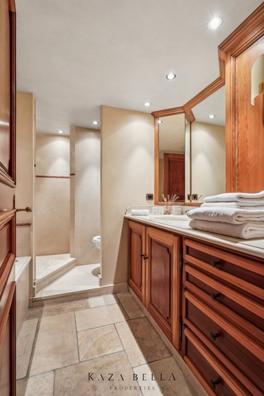 The second bedroom, separate and elegant, is furnished with a king‑size bed (240 x 200 cm) and has its own en suite bathroom nearby. A separate toilet completes this level.