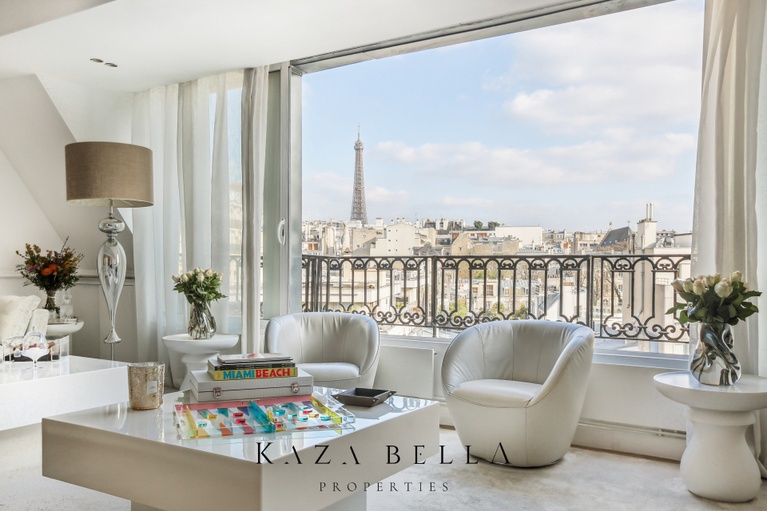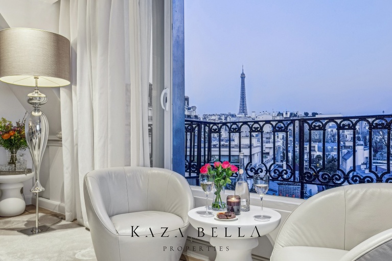 The spacious living room, bathed in natural light, is enhanced by a 7‑meter‑wide bay window offering breathtaking views of the Eiffel Tower. The ambiance is warm and elegant thanks to a user‑friendly bioethanol fireplace, perfect for relaxing moments with family or friends.